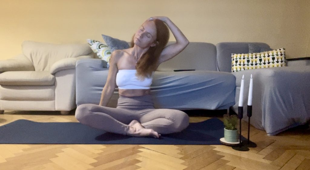 From Suhasana, you can perform a few easy stretches for the neck by holding your head towards the left ear with the palm of your right hand and gently pulling to the right. Then do the same in the opposite direction.