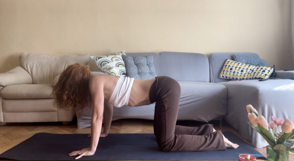 Start on all fours: I am placing my palms under my shoulders and knees under my hips. It is important to feel your back neutral.